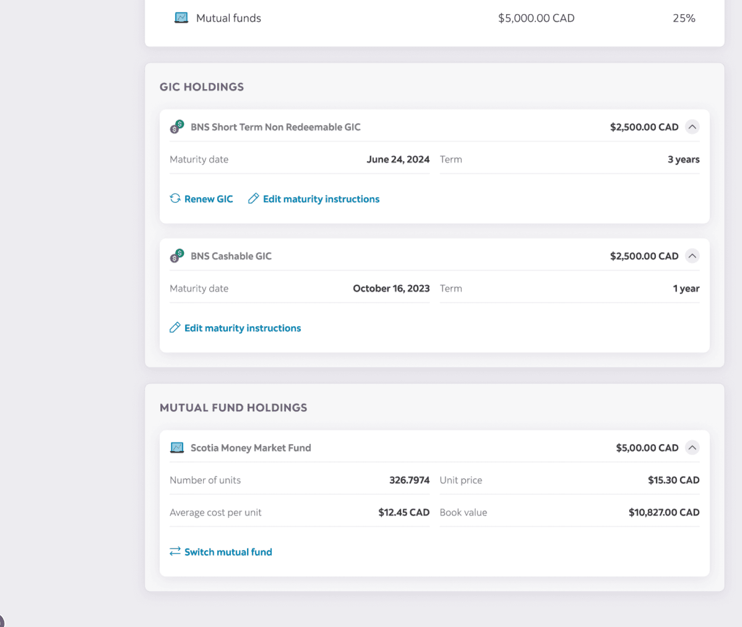 ❌ There was some confusion in grasping that the GIC holdings and Mutual funds funds summary in the cards was the same as the GIC and mutual funds listed in the holding cards.