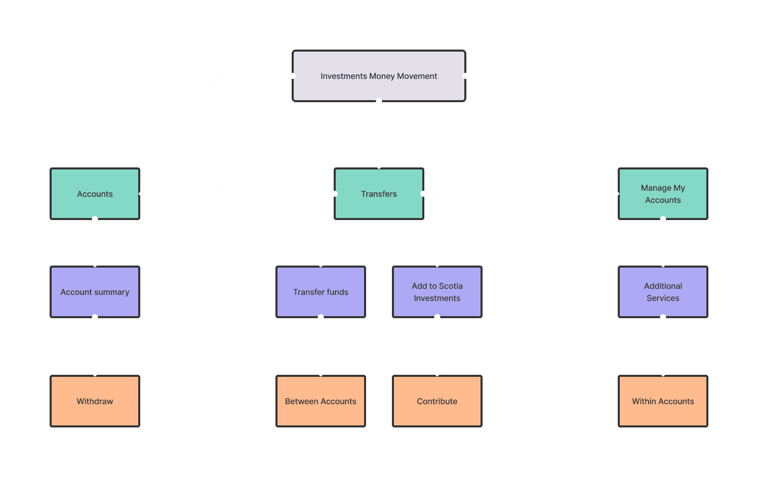 The investment experience on our old platform was fragmented, with features like transfers, contributions, and withdrawals scattered across different sections of the platform. I decided this would not align with todays clients mental models, so we decided that a new goal of this project was to rethink the information architecture so clients can find investment features more easily and in the context of their tasks. This meant flattening our current information architecture.